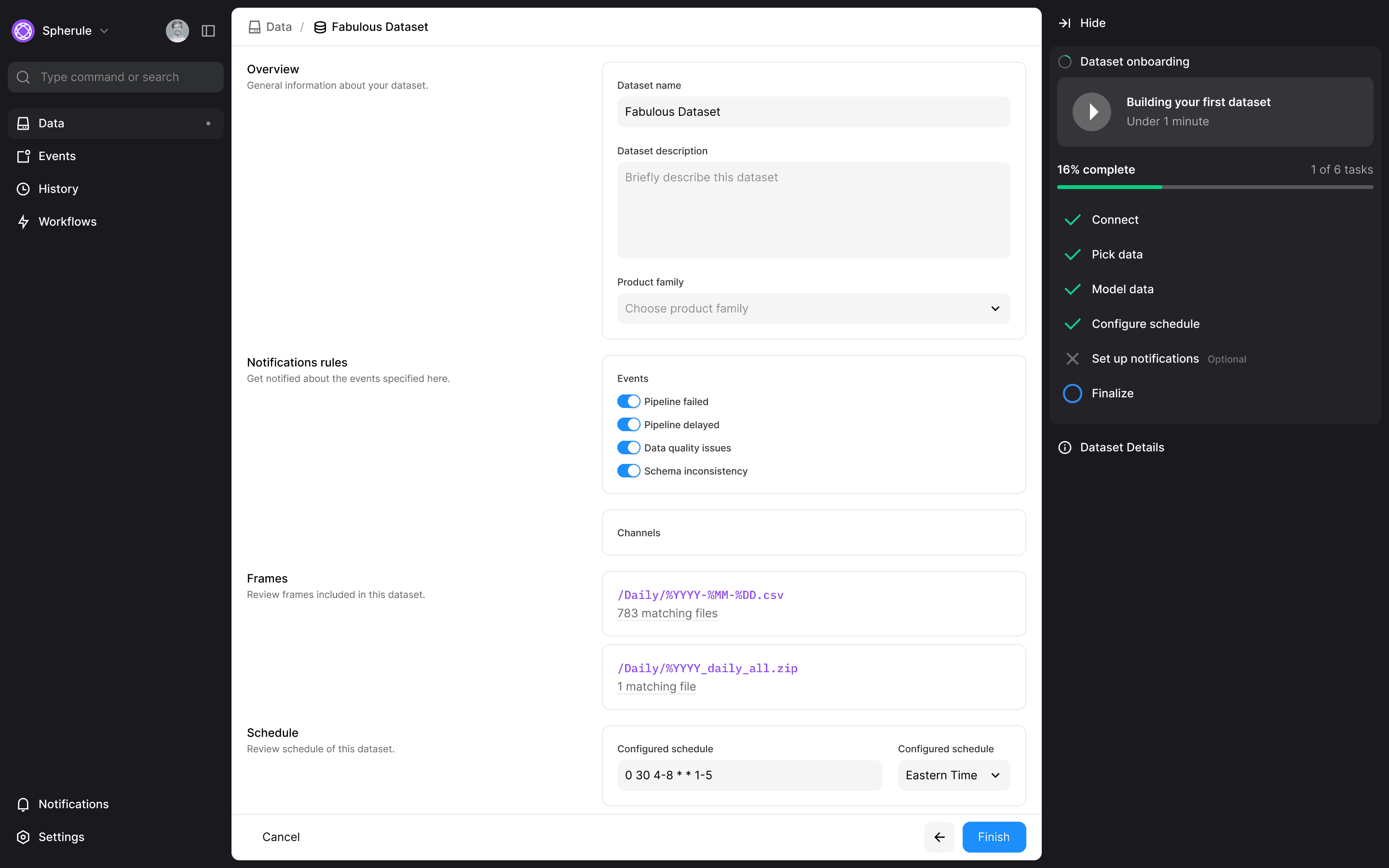 Default selections, smart recommendations, and skippable optional steps mean power users can create production-ready data products in under 10 minutes.