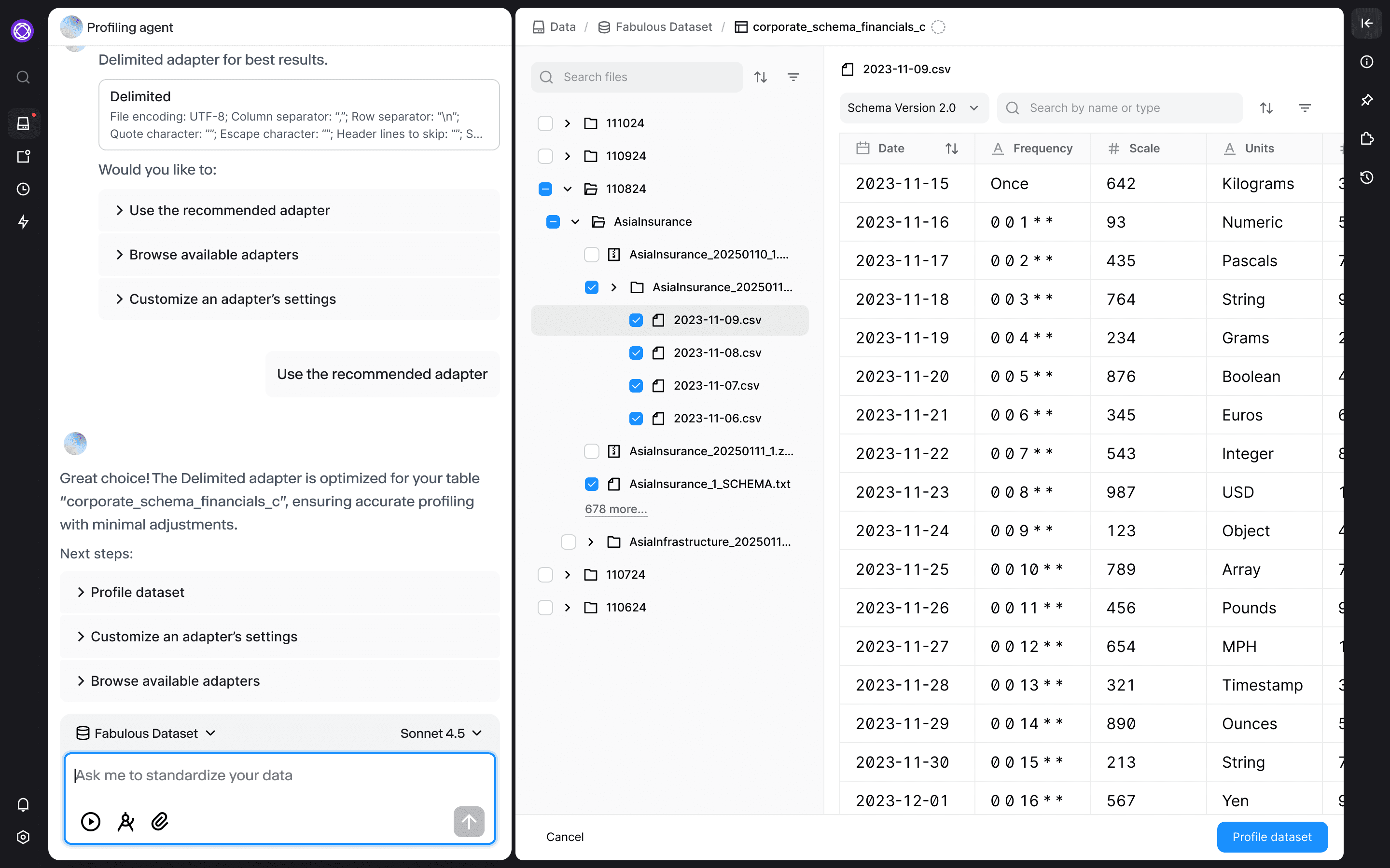 Users select source files and the system automatically detects schemas, suggests optimal adapters, and validates data quality without requiring any code.