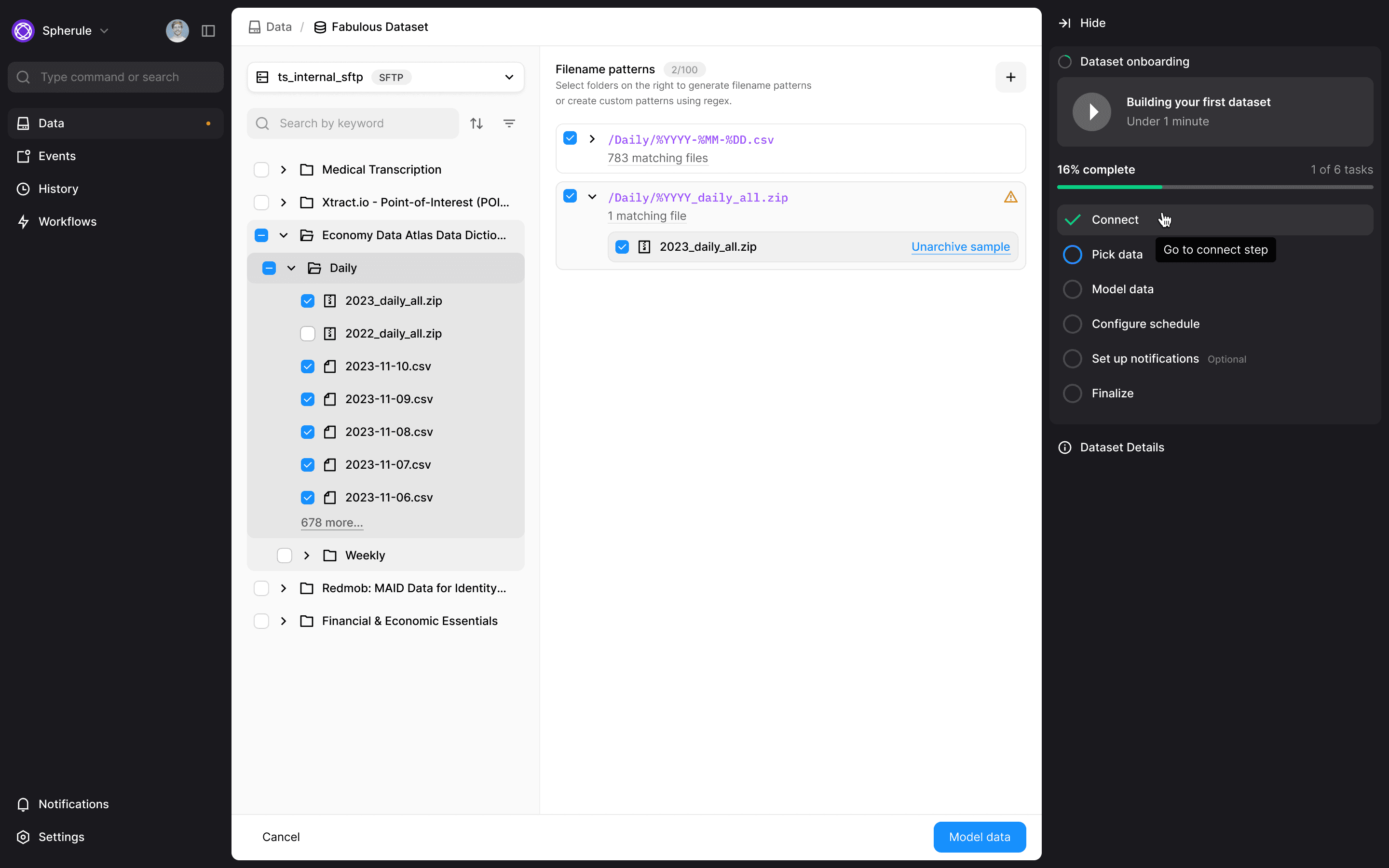 Before finalizing, users see formatted data previews, schema summaries, and matching file counts to catch errors early and build confidence in the configuration.