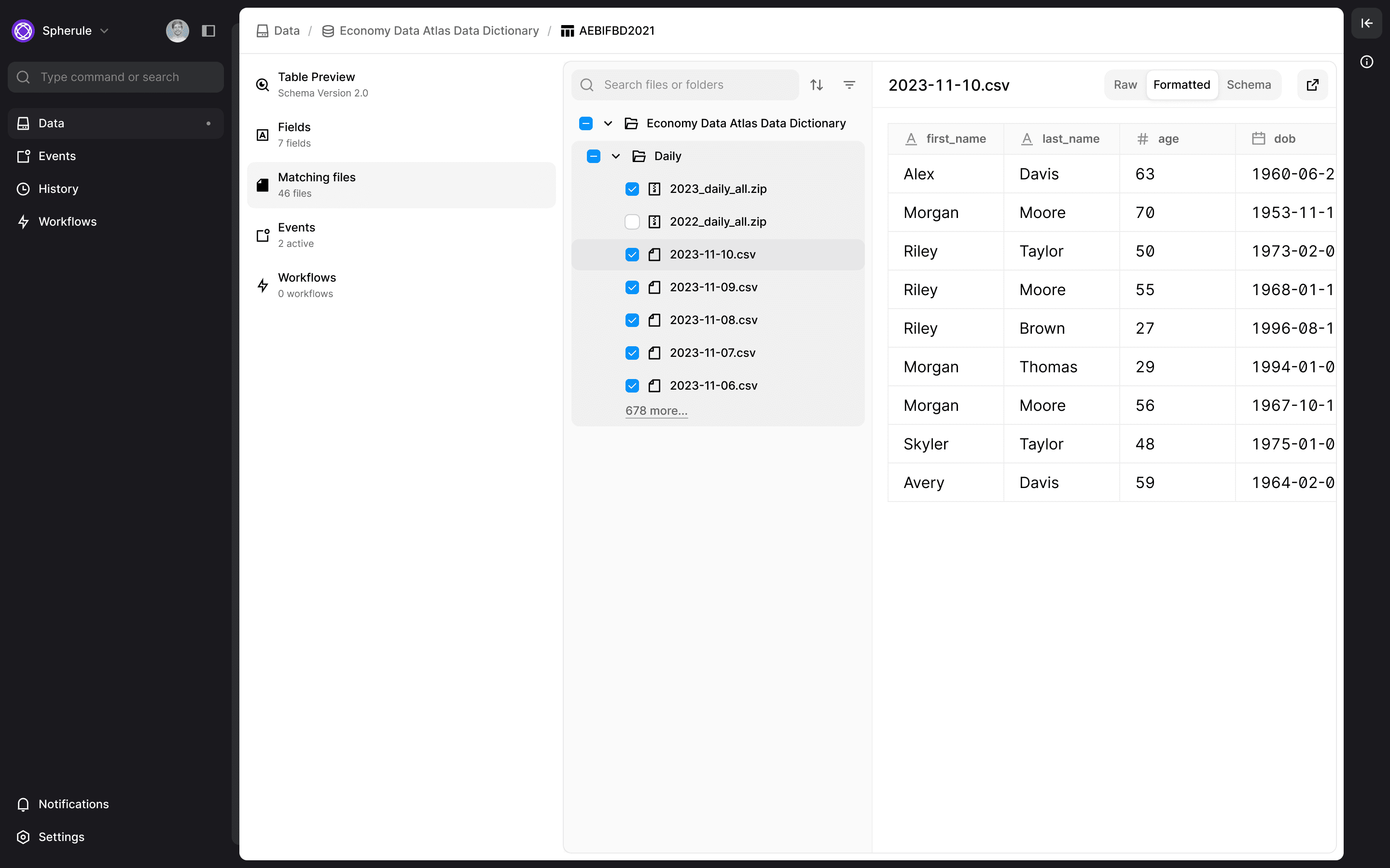 Rather than showing configuration forms first, users see actual data previews with formatted tables and schema detection, making the impact of their choices tangible.